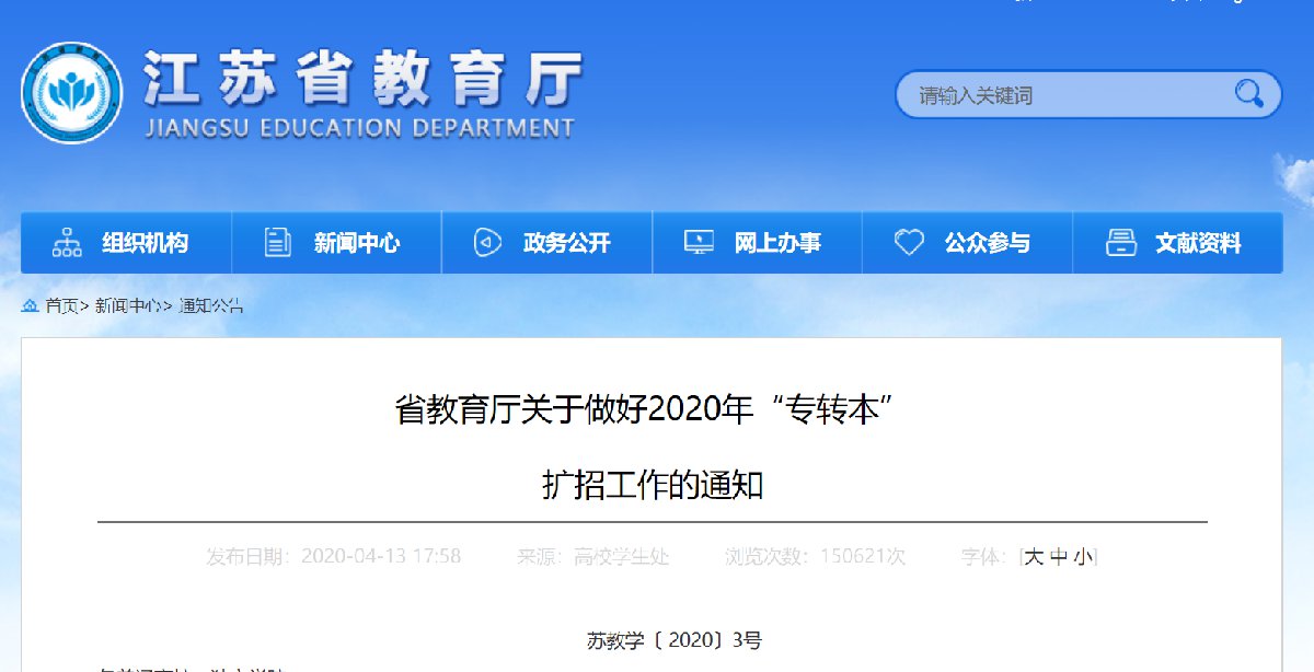 2020年4月13日,江苏省教育厅发布关于做好2020年“专转本”扩招工作的通知。