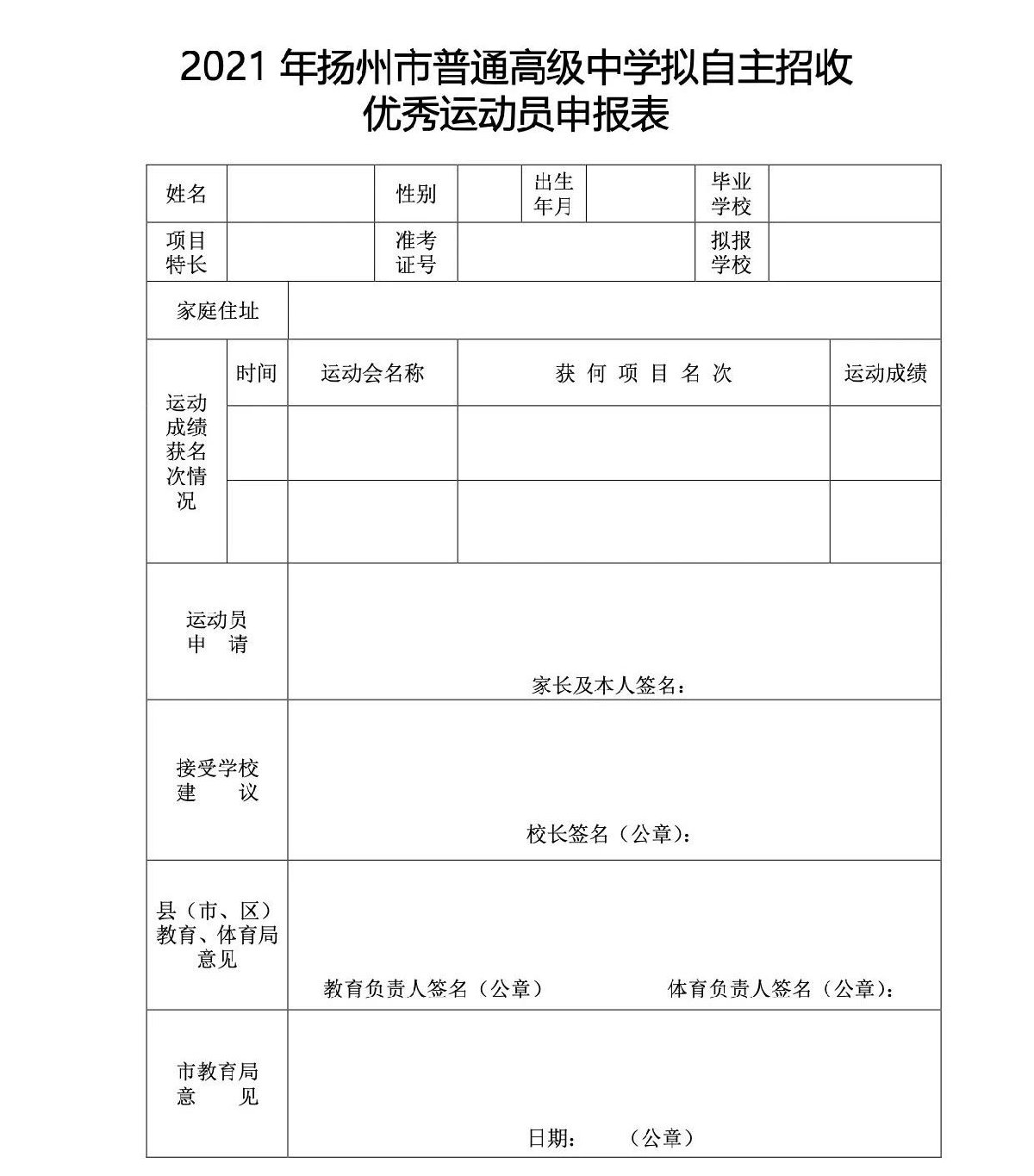 1. 5月16日前,由学生本人及家长提出申请,填写《2021年扬州市普通高级中学拟自主招收优秀运动员申报表》(附后)一式三份,并提供《运动员等级证书》等相关证明材料一并交学生所在初中学校校长室。
